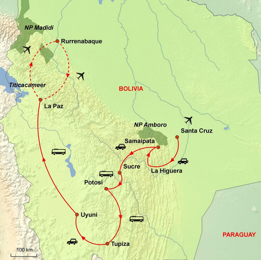 Bolivia is fascinerend en divers. Tijdens je individuele rondreis wisselt cultuur en natuur elkaar af. Maak kennis met de cultuur in het hoog gelegen La Paz. Struin over kleurrijke markten, bezoek musea en proef de lokale keuken. Vanuit La Paz kun je veel kanten op. Ten noordoosten van de stad ligt Coroico. De omgeving van dit dorp is perfect voor wandelingen langs koffieplantages en vanuit hier kun je de populaire Death Road mountainbiken. Ten noordwesten van La Paz ligt het hoogst bevaarbare meer ter wereld, namelijk het Titicacameer. Vanuit hier kun je je rondreis door Bolivia vervolgen naar Peru. Verder zuidwaarts ga je naar de Salar de Uyuni. Het is een onbetwist hoogtepunt van je reis. Het is de grootste zoutvlakte ter wereld waar je ongetwijfeld je ogen uitkijkt. In een jeep rij je over de eindeloze witte vlakte, ervaar je surrealistische landschappen van de Daliwoestijn en bewonder je de vele gekleurde meren. Tot slot, de Amazone. Net als veel andere Zuid-Amerikaanse landen, ligt ook een gedeelte van Bolivia in de Amazone. Verken onder leiding van een gids de bergachtige nevel- en tropische wouden, spot veel wilde dieren en maak een boottocht per kano. Natuurlijk zijn er naast deze bezienswaardigheden, nog meer gebieden die de moeite waard zijn. Deze bespreekt onze reisspecialist graag met je.
