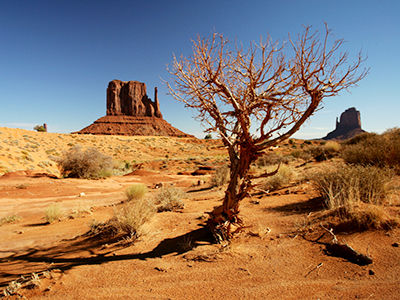 Op de grens van Arizona en Utah liggen de adembenemende zandsteenrotsen en tafelbergen van Monument Valley.