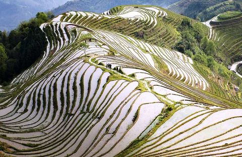 Via de verbluffende rijstterrassen bij Ping'an kom je aan in Yangshuo, waar de tour eindigt. In de omgeving draaien brede rivieren traag door groene rijstvelden en vreemd gevormde bergpieken. Een onwerkelijk landschap dat je nog lang zal bijblijven.